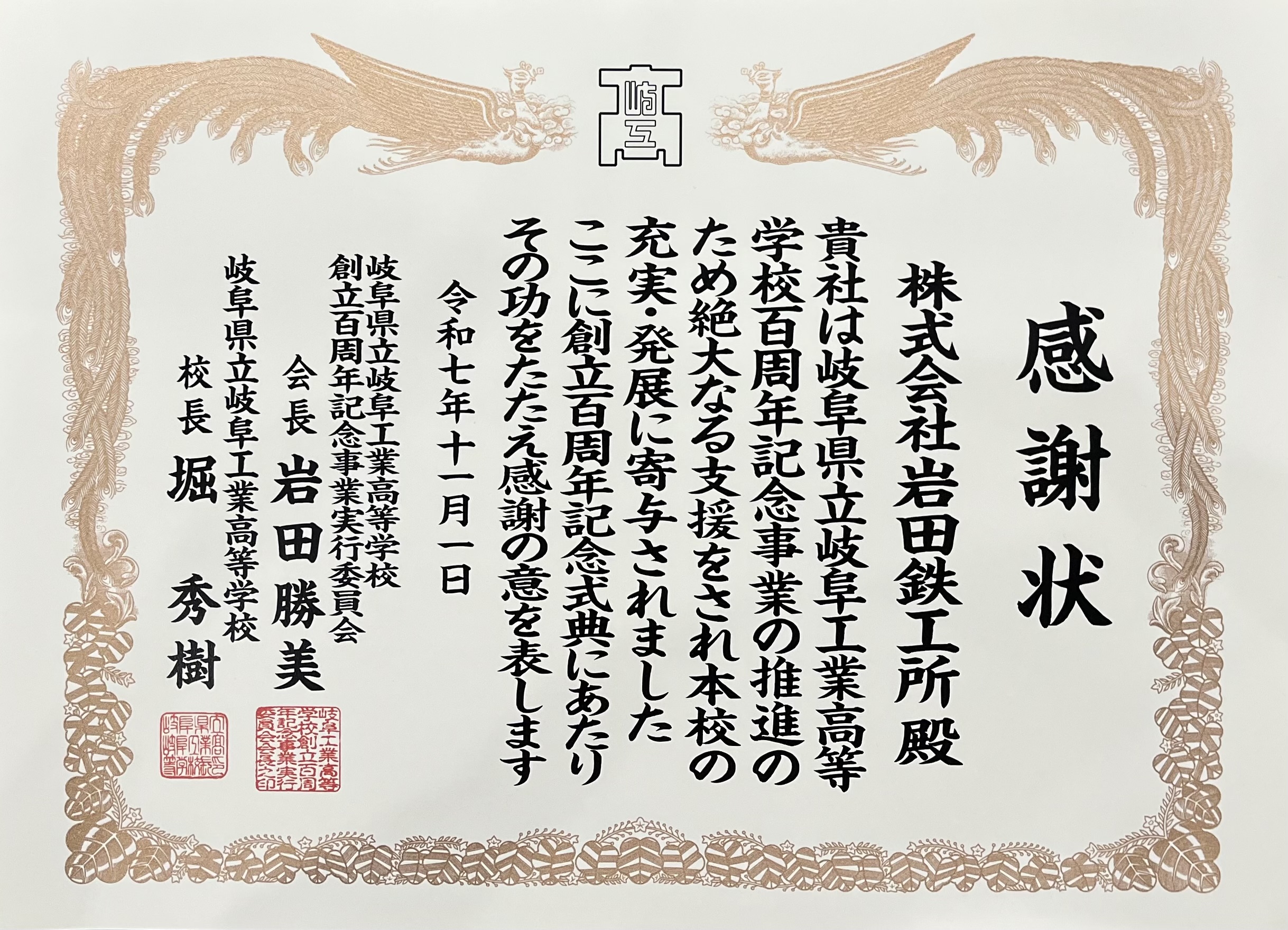 創立100周年を迎えた岐阜県立岐阜工業高等学校より、感謝状を贈呈いただきました。