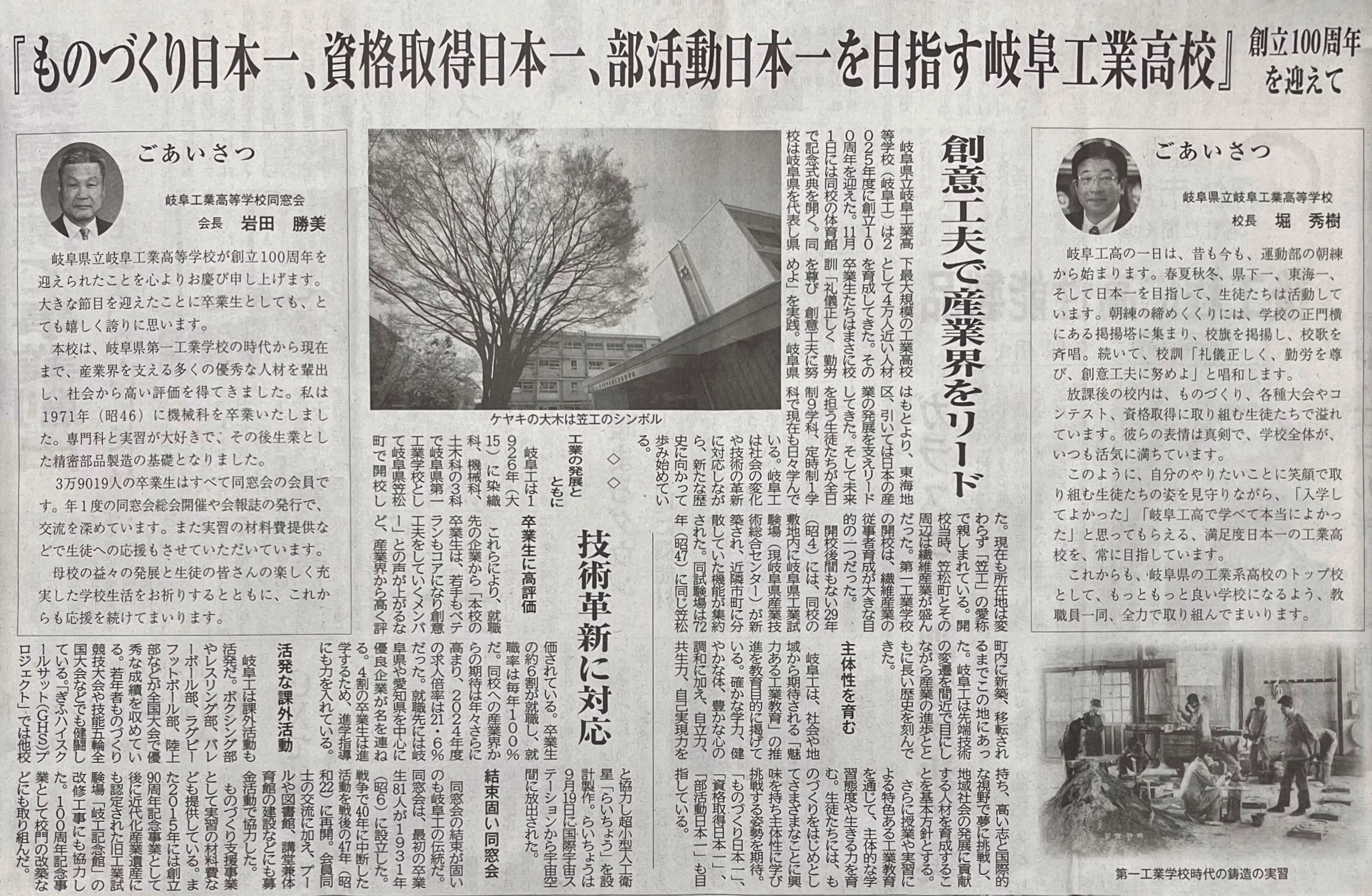 日刊工業新聞に岐阜工業高等学校創立100周年の同窓会会長を務める 岩田勝美(岩田鉄工所 会長)のコメントが掲載されました。