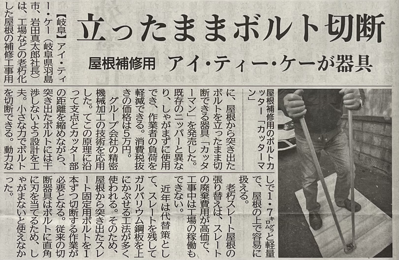 日刊工業新聞に屋根補修用ボルトカッター「カッターマン」が掲載されました。